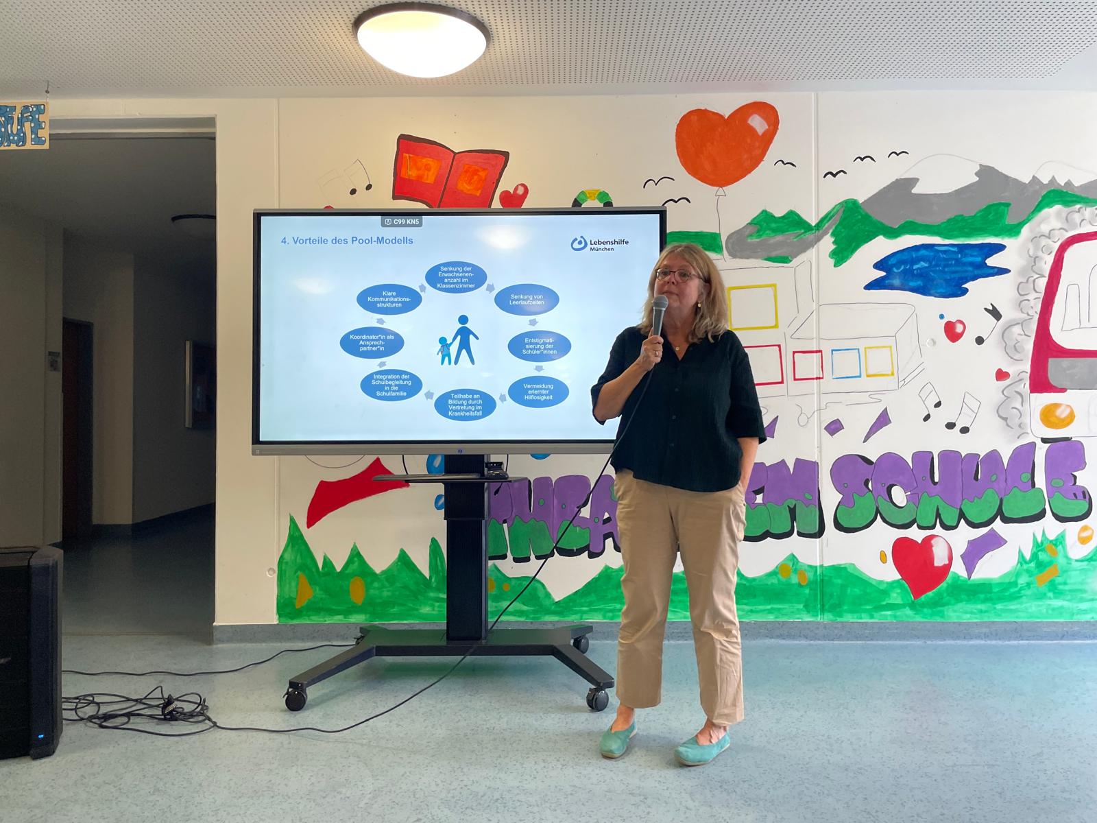 Im Rahmen unseres Pilotprojekts, der Pool-Bildung an der Thea Diem Schule in Unterhaching (Förderzentrum für geistige Entwicklung) ab diesem Schuljahr (24/25), erhöhen wir die Flexibilität in der Ausgestaltung der Schulbegleitung gemeinsam mit den schulischen Akteuren und Akteurinnen. Das Schulbegleiter:innenteam ist für die derzeit 42 leistungsberechtigten Kinder und Jugendlichen da und kann bei Bedarf variabel eingesetzt werden. Der Schulbesuch kann weitgehend gewährleistet werden, und die Schüler:innen müssen nicht zu Hause bleiben, wenn etwa die vorgesehene Schulbegleitung erkrankt ist. Kinder mit hohen individuellen Bedarfen können trotzdem noch 1:1 begleitet werden. Unterstützt wird der Einsatz durch ein Koordinatorinnenteam der Lebenshilfe München vor Ort an der Schule. Das Team kennt die Bedarfe der Schüler:innen genau, kann Vertretungen individuell angepasst organisieren und mehrere Leistungsberechtigte einer Schulbegleitung zuordnen. Sehr positiv ist zudem, dass die Unterstützung von Kindern und Jugendlichen der Klasse im Pool-Modell auch abgedeckt ist und zur Entstigmatisierung der begleiteten Kinder und Jugendlichen führt.